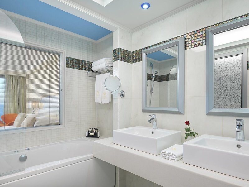 - Deluxe Junior Suite Sea View (JSM1), junior suite, nemdohányzó szoba, a főépületben, tengerre néző, kb 52 m², összesen szobaszám ebben a szobatípusban: 1, elrendezése a következő: kombinált nappali/hálószoba , 1 pótágy, babaágy: ingyenes, Igény szerint klíma: ingyenes, egyénileg állítható, központilag szabályozható, hideg, meleg, padló: laminált, széf: ingyenes, Nespresso gép, kávé/teafőző, minibár: térítés ellenében, all inclusive, telefon, Internet: WLAN/ WiFi: ingyenes, televízió: német műsor, műholdas TV, szobaszerviz: naponta, térítés ellenében, takarítás: ingyenes, zuhanyzó, fürdőkád, WC, fürdőköpeny: ingyenes, papucs: ingyenes, hajszárító, erkély vagy terasz: ülőgarnitúrával