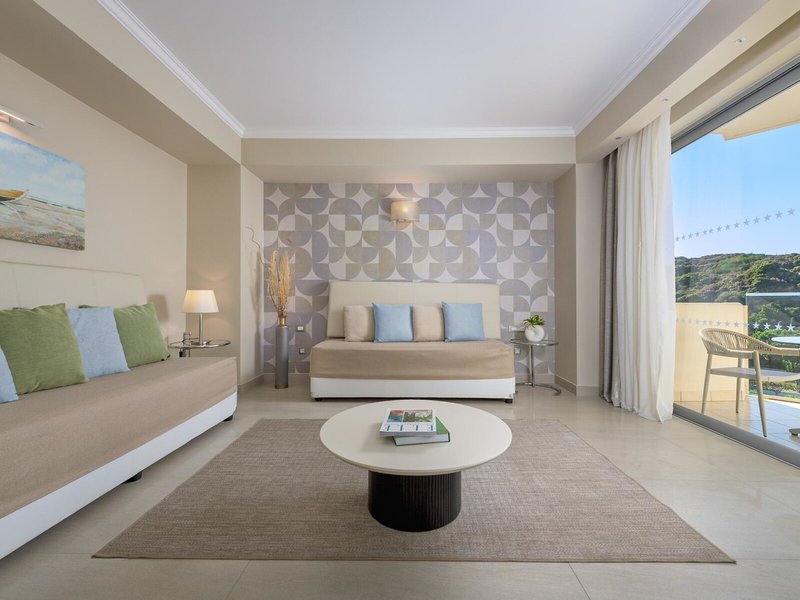 - Superior Family Suite sea view (FZM1), Suite, Nichtraucherzimmer, im Hauptgebäude, Meerblick, ca. 80 m², Gesamtanzahl der Räume in diesem Zimmertyp: 2, Aufteilung wie folgt: bestehend aus 2 Zimmern, optisch getrennt durch Schiebetür, 1 Schlafzimmer, 2 Einzelbetten, 2 Schlafsofas, Babybett: ohne Gebühr, Klimaanlage: ohne Gebühr, individuell regelbar, zentral gesteuert, kalt, warm, Fußboden: Laminat, Safe: ohne Gebühr, Nespressomaschine, Kaffee-/Teezubereiter, Minibar: gegen Gebühr, bei All Inclusive inklusive, Telefon, Internet: WLAN/WiFi: ohne Gebühr, Fernseher: Flatscreen, im Wohnbereich, im Schlafzimmer, deutsches Programm, Sat-TV, Roomservice: gegen Gebühr, Reinigungsservice: ohne Gebühr, Badewanne oder Dusche, Dusche, Badewanne, Bademantel: ohne Gebühr, Slipper: ohne Gebühr, 2 Bäder, Föhn, Kosmetikspiegel, Balkon