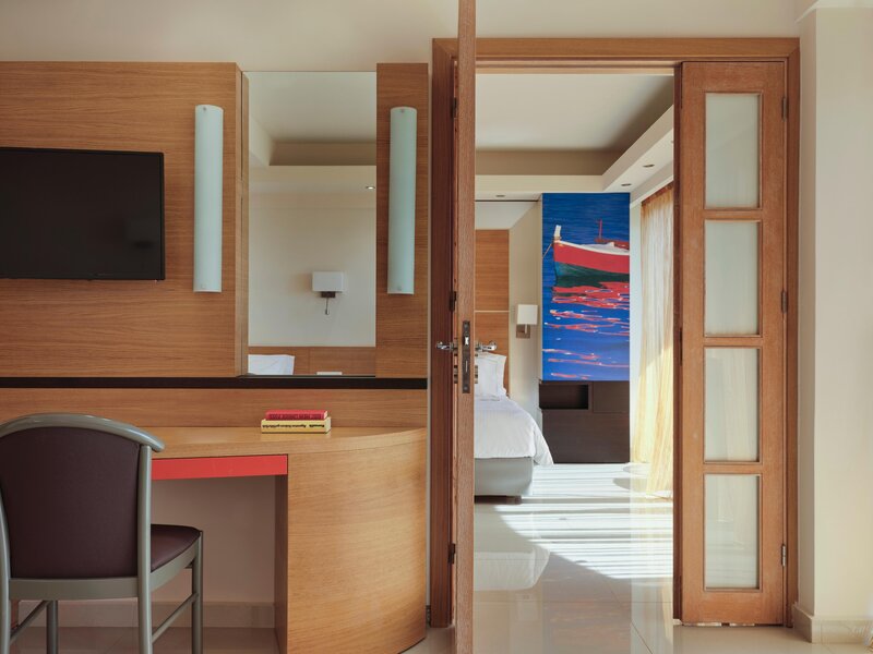 modern szobák légkondicionálóval, műholdas TV-vel, mini hűtőszekrénnyel, széffel, WiFi-vel (beleértve), hajszárítóval, WC-vel és erkéllyel felszereltek. Kétágyas hálószoba, fürdőszoba káddal és részleges kilátás a tengerre. A családi szobák valamivel tágasabbak, nemrégiben felújítottak és zuhanyzós fürdőszobával, további hálószobával és külön WC-vel rendelkeznek. Oldalsó kilátás a tengerre.