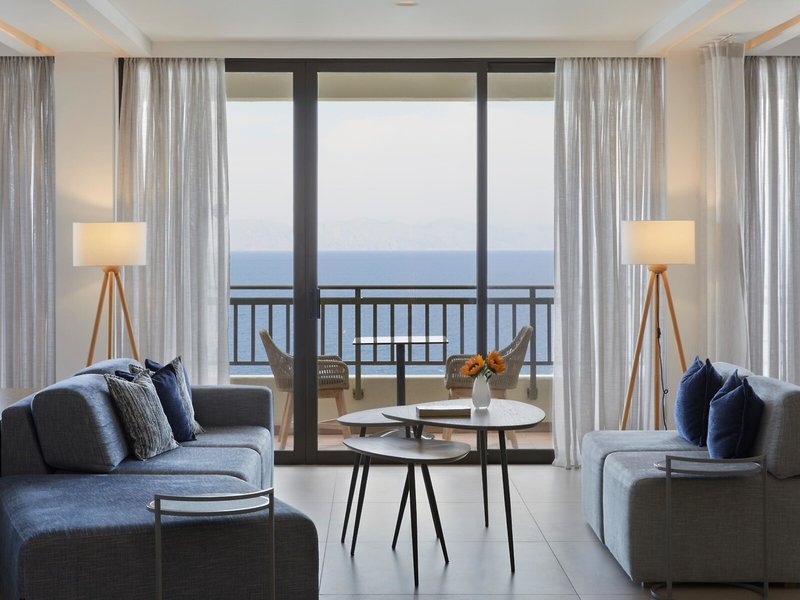 - Premium Deluxe Sea View (DZM3), Doppelzimmer, Nichtraucherzimmer, im Hauptgebäude, Meerblick, ca. 27 m², letzte Komplettrenovierung 2022, Gesamtanzahl der Räume in diesem Zimmertyp: 1, Aufteilung wie folgt: kombiniertes Wohn-/Schlafzimmer, 2 Einzelbetten, 1 Doppelbett, 1 Schlafsofa, Klimaanlage: zentral gesteuert, Fußboden: Laminat, Safe, Sitzecke, Sofa, Minibar, Telefon, Internet: WLAN/WiFi, Fernseher: deutsches Programm, Deutsche Welle, Sat-TV, Roomservice, Reinigungsservice, Badewanne oder Dusche, WC, Bademantel, Slipper, Föhn, Kosmetikspiegel, Balkon: mit Sitzgelegenheit