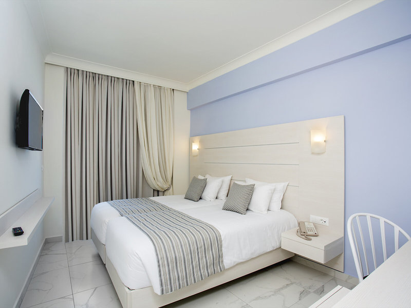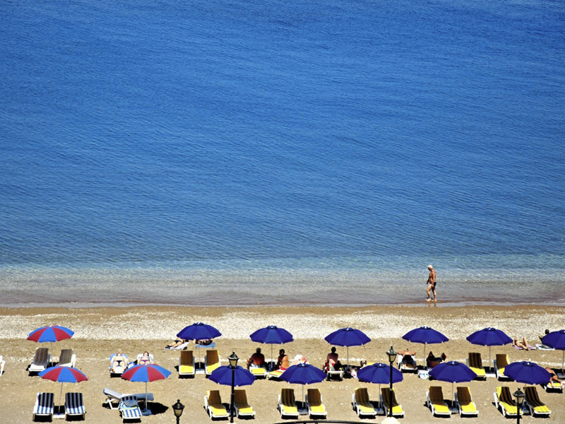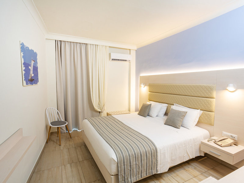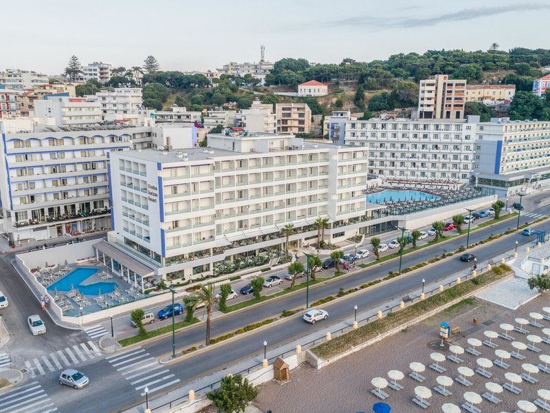 Lage & Umgebung Das Hotel ist zentral in Rhodos-Stadt mit seinen Unterhaltungsmöglichkeiten und Sehenswürdigkeiten gelegen. Der Psaropoula Strand liegt etwa ca. 50 m entfernt. Zum Stadtzentrum sind es ca. 750 m, und der Flughafen ist etwa 15 km entfernt. Transferzeit ca. 20 Minuten.