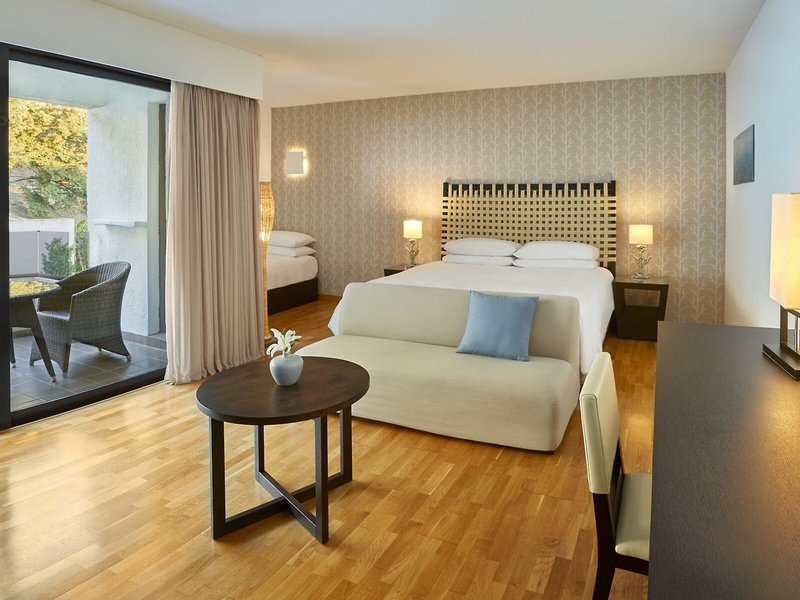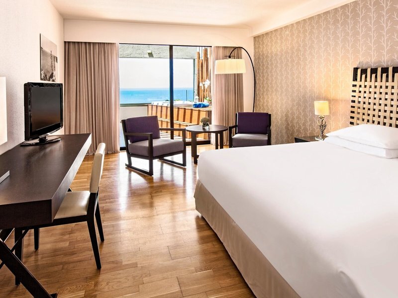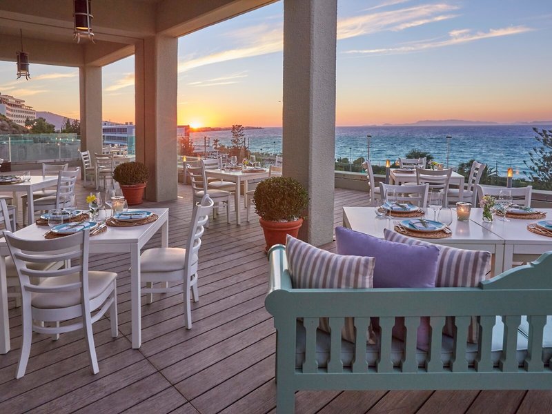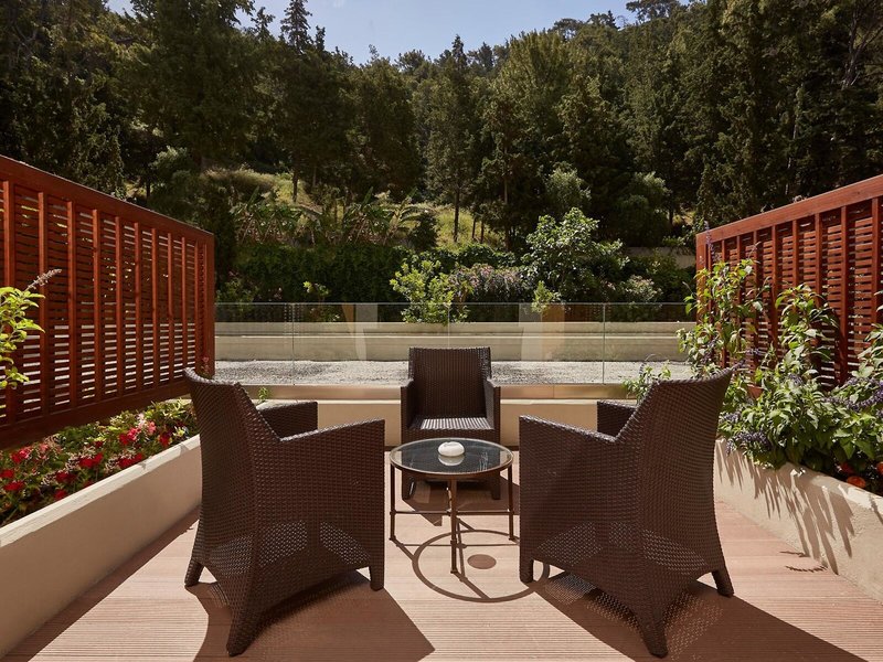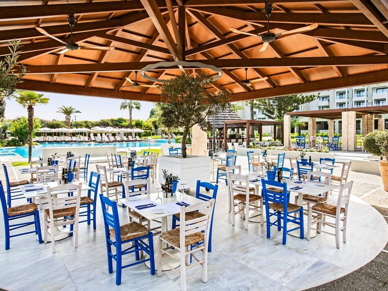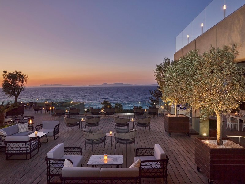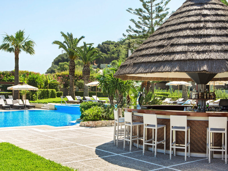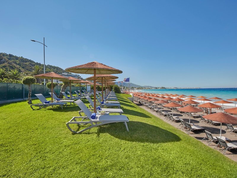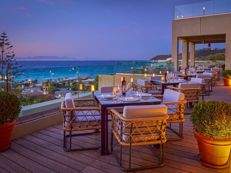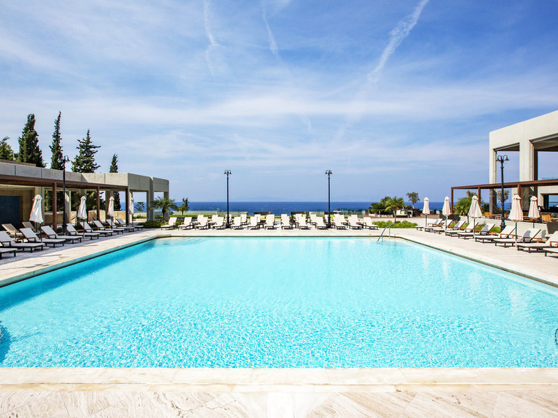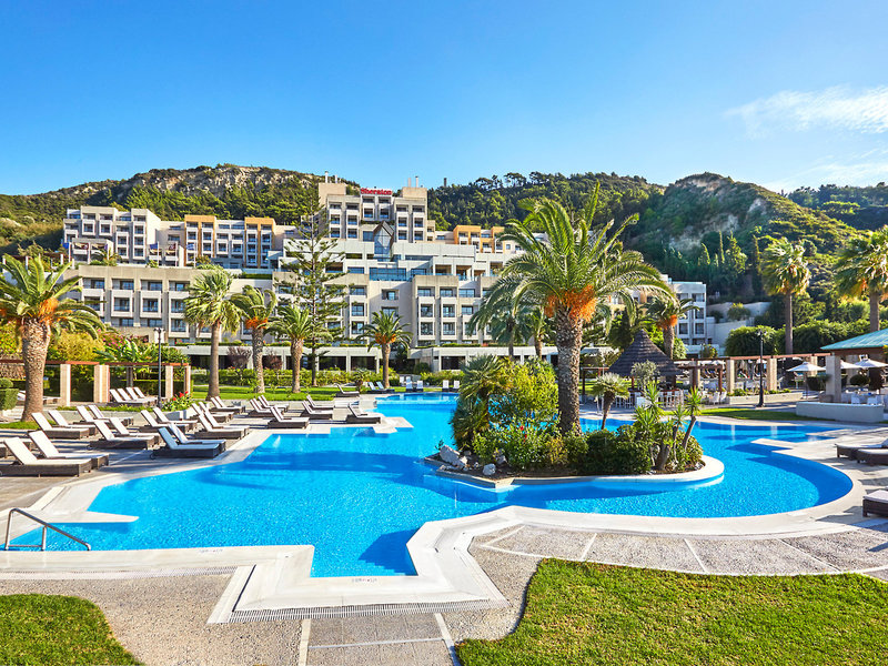 Lage & Umgebung Das an einem dicht bewaldeten Hügel gelegene Resort begeistert durch seine ungewöhnliche Architektur. Die luxuriöse, terrassenförmig angelegte Hotelanlage ist eingebettet in eine 80.000 qm große Gartenanlage und bietet einen atemberaubenden Blick auf das Ägäische Meer. Die Empfangshalle und die lichtdurchfluteten Gemeinschaftsbereiche beeindrucken durch zeitgenössisches Design. Der flach abfallende Sand-/Kiesstrand von Ixia ist durch eine Unterführung der Uferstraße erreichbar (ca. 50 m). Nach Rhodos-Stadt ca. 4 km (Linienbus).