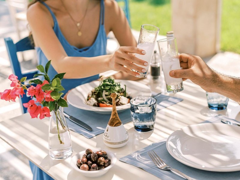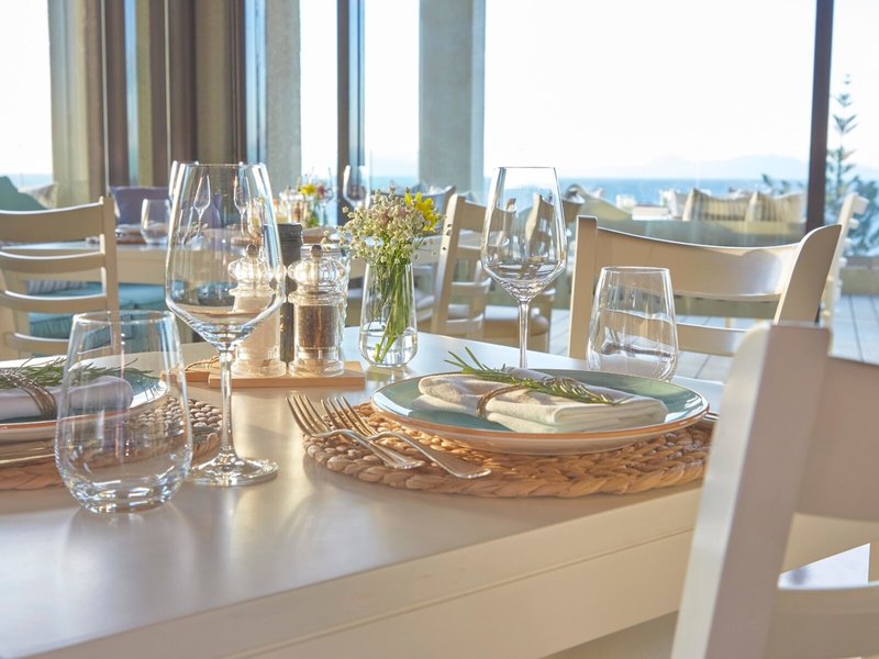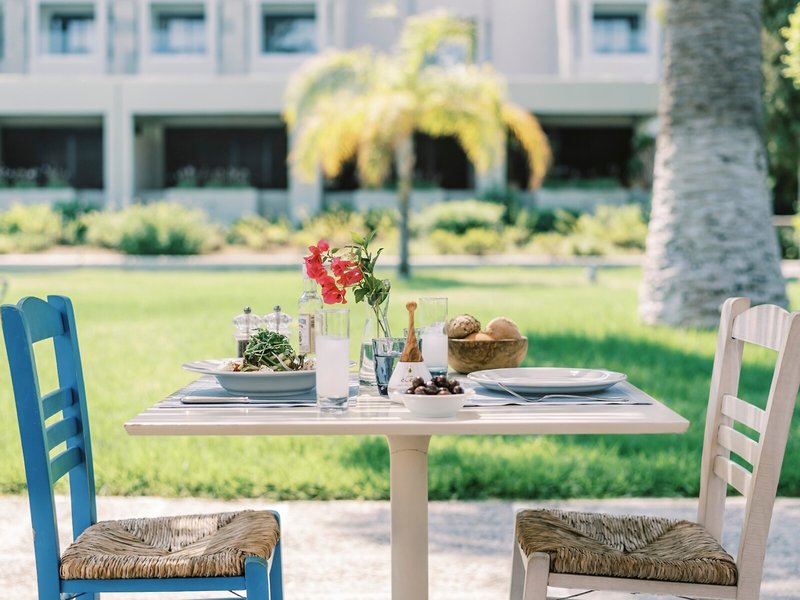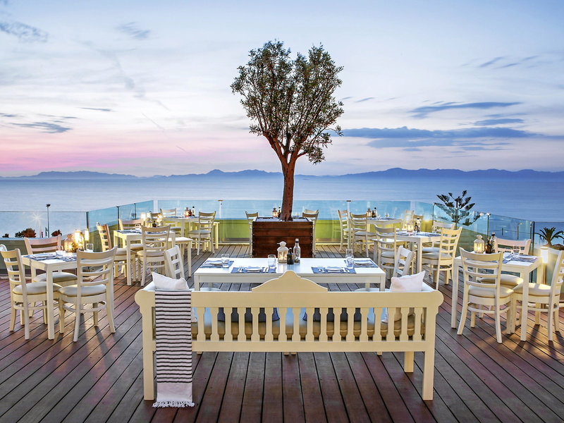 - Spezialitätenrestaurant „Thea“: Küche: griechisch, mediterran, regional, Fisch/Meeresfrüchte, saisonale Gerichte, vegetarische Gerichte, à la carte, Menüwahl, Juni - September, täglich, mit Terrasse, Raucherbereich, angemessene Kleidung erwünscht