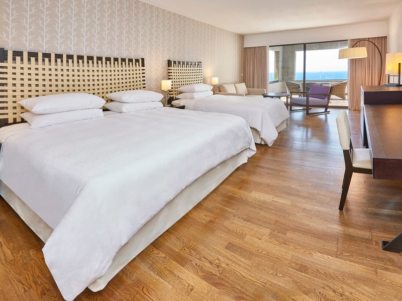 - Family Room Sea View (FZM1), Familienzimmer, im Hauptgebäude, Meerblick, ca. 45 m², letzte Komplettrenovierung 2011, letzte Teilrenovierung 2021, Gesamtanzahl der Räume in diesem Zimmertyp: 1, Aufteilung wie folgt: 1 Schlafzimmer, 2 Einzelbetten, 1 Doppelbett, Babybett: ohne Gebühr, Klimaanlage: ohne Gebühr, individuell regelbar, zentral gesteuert, Fußboden: Parkett, Safe: ohne Gebühr, Schreibtisch, Bügeleisen, Bügelbrett, Kühlschrank: ohne Gebühr, Kaffee-/Teezubereiter, Wasserkocher, Telefon, Internet: WLAN/WiFi: ohne Gebühr, Fernseher: Flatscreen, im Schlafzimmer, deutsches Programm, Sat-TV, Radio, Roomservice: gegen Gebühr, Reinigungsservice, Dusche, WC, Bademantel: ohne Gebühr, Slipper: ohne Gebühr, Föhn, Balkon: mit Sitzgelegenheit