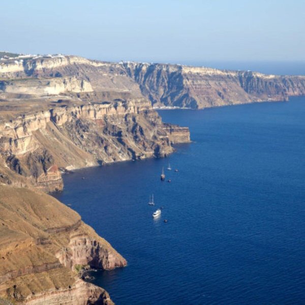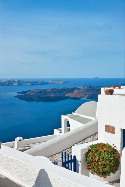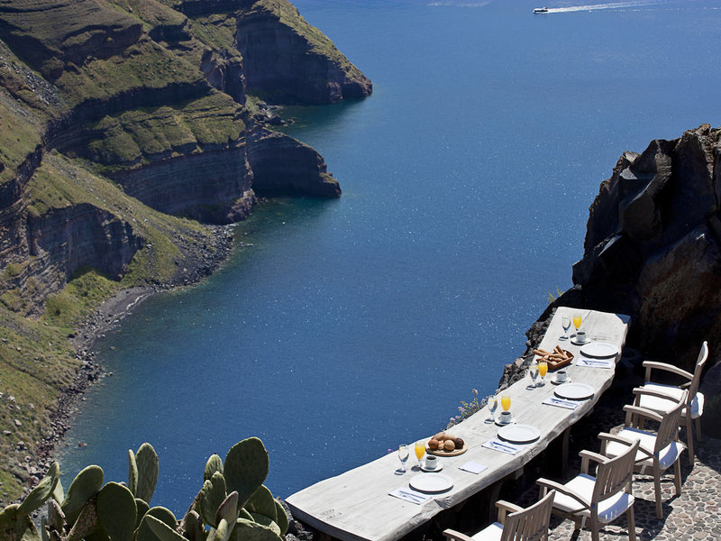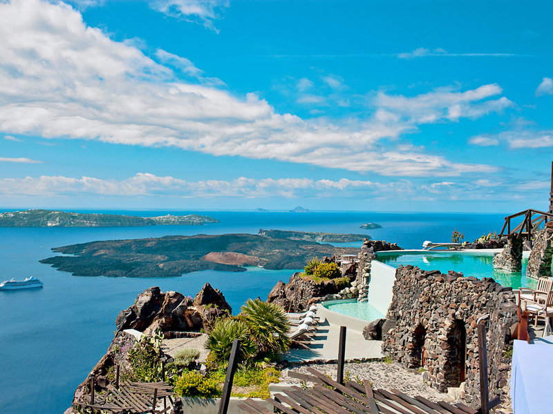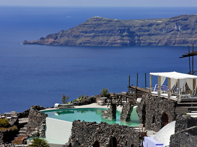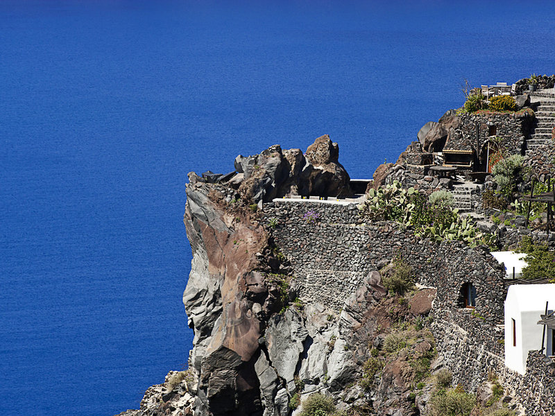 Lage & Umgebung Absolut spektakulär und atemberaubend, auf einem imposanten Felsvorsprung schwarzen Lavagesteins in unübertrefflicher Lage direkt am Kraterrand. Hoch über der tiefblauen Ägäis mit faszinierendem Panoramablick auf die einzigartige, bizarre Szenerie des Kraterrandes und das Meer. Ein schmaler Stufenweg führt zur Anlage. Tavernen und Geschäfte befinden sich im Ort, ca. 200 m entfernt. Thira erreichen Sie auf einen romantischen Weg entlang des Kraterrandes in ca. 25 Gehminuten oder per Linienbus, Haltestelle ca. 200 m.