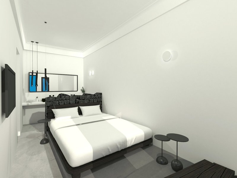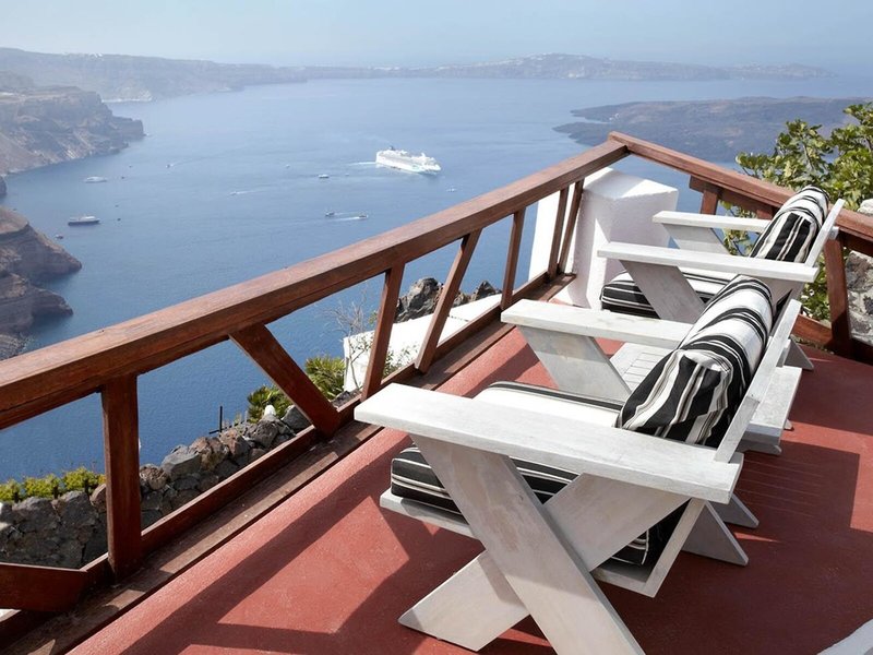 Elhelyezkedés és környezet Abszolút látványos és lélegzetelállító, lenyűgöző fekete lávasziklák párkányán, felülmúlhatatlan helyen, közvetlenül a kráter peremén. Magasan a mélykék Égei-tenger felett, lenyűgöző panorámával a kráter peremének és a tengernek egyedülálló, bizarr tájára. A komplexumhoz keskeny lépcsőút vezet. Tavernák és üzletek találhatók a városban, kb 200 m-re. Thira egy romantikus ösvényen, a kráter peremén, gyalog vagy busszal kb. 25 perc alatt elérhető, megálló kb. 200 m.