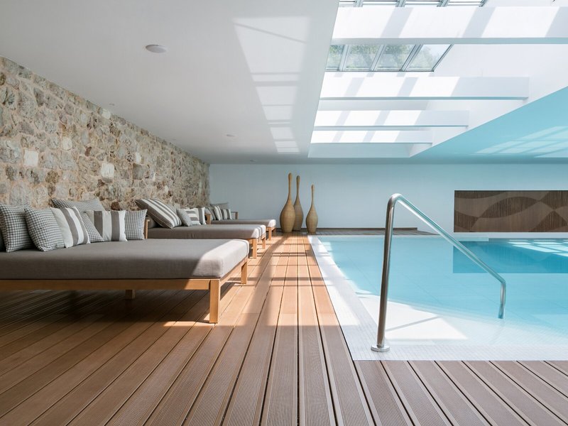 - Medencék: fedett medence, medence melletti napernyők, medence melletti nyugágyak