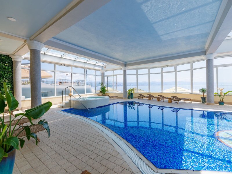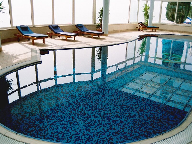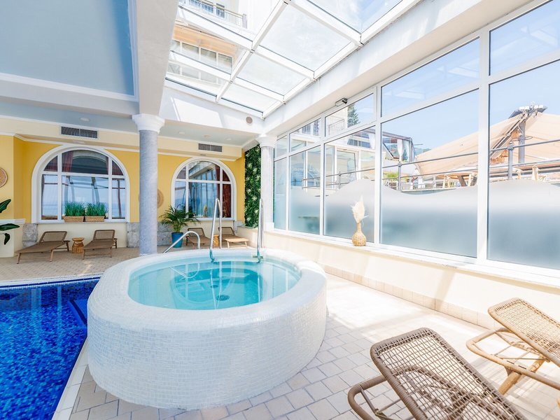 - Medencék: Fűtött kültéri medence, beltéri medence, kültéri medence, medence melletti napernyők, medence melletti nyugágyak