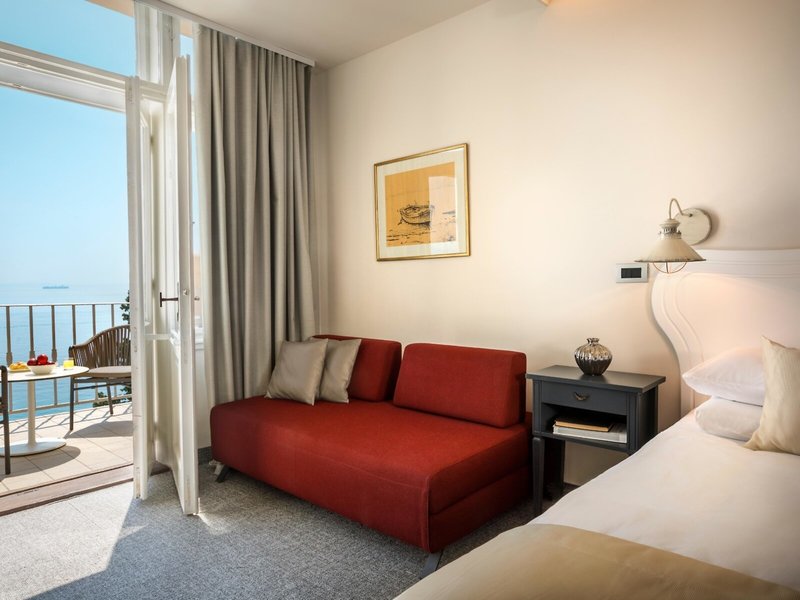 - Superior double room, sea view (DZM1), Doppelzimmer, Meerseite, Meerblick, ca. 22 - 27 m², 1 Doppelbett (180x200cm), 1 Schlafsofa (90x200cm), Babybett: ohne Gebühr, Anfrage notwendig, Reservierung nicht notwendig, Klimaanlage: zentral gesteuert, Heizung: zentral gesteuert, Fußboden: Teppichboden, Safe: gegen Gebühr, Schreibtisch, Telefon, Internet: WLAN/WiFi, Fernseher, Dusche, Balkon: mit Sitzgelegenheit