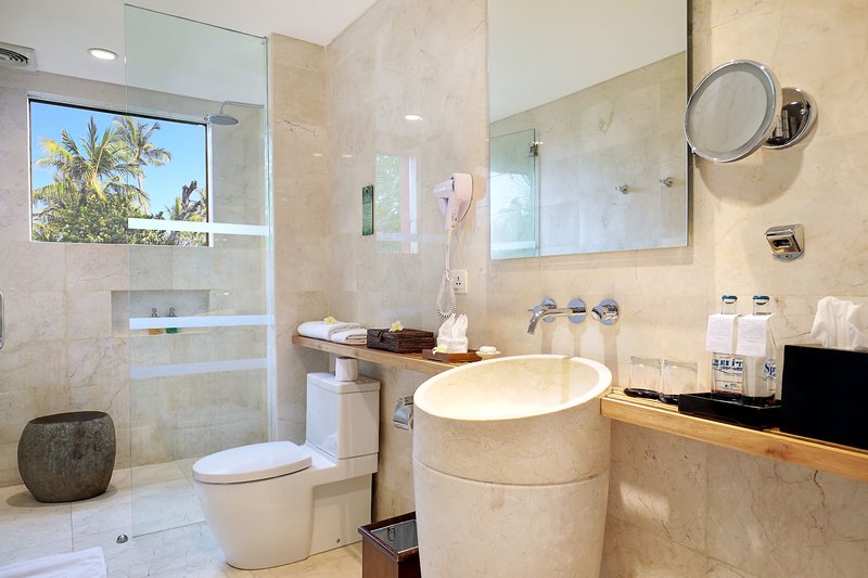 Hinweis: Auf Bali können Waschbecken oder auch Badewannen/Whirlpools offen ohne räumliche Trennung im allgemeinen Wohnbereich des Hotelzimmers integriert sein.