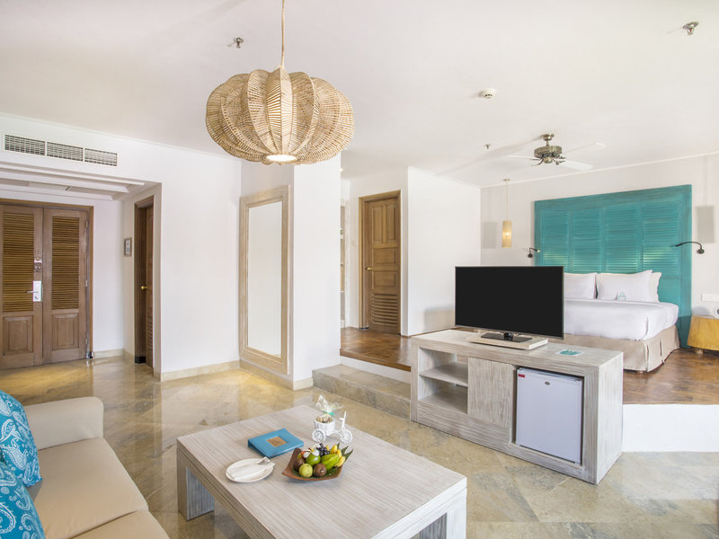 - Sol Jr. Suite (JSX1), Juniorsuite, Nichtraucherzimmer, im Hauptgebäude, Gartenseite, Poolblick, Gartenblick, ca. 70 m², Gesamtanzahl der Räume in diesem Zimmertyp: 1, Aufteilung wie folgt: kombiniertes Wohn-/Schlafzimmer, 1 King Size Bett (180x200cm), Babybett: ohne Gebühr, Klimaanlage: individuell regelbar, Fußboden: Fliesenboden, Safe: gegen Gebühr, Deckenventilator, Sitzecke, Sofa, Minibar: gegen Gebühr, bei All Inclusive inklusive, Softdrinks: gegen Gebühr, bei All Inclusive inklusive, Wasser: gegen Gebühr, bei All Inclusive inklusive, Snacks: gegen Gebühr, bei All Inclusive inklusive, Minibarauffüllung: täglich, Telefon, Internet: WLAN/WiFi: ohne Gebühr, Fernseher: Flatscreen, im Schlafzimmer, Sat-TV, Roomservice: täglich, gegen Gebühr, Reinigungsservice: täglich, ohne Gebühr, Dusche, Regendusche, separates WC, Bademantel: ohne Gebühr, Föhn, Kosmetikspiegel, Balkon: mit Sitzgelegenheit, Balkon oder Terrasse