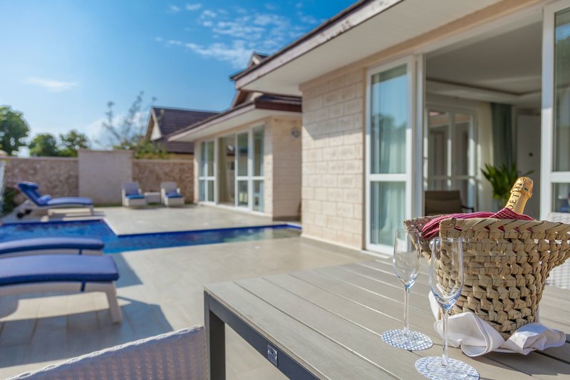 3 hálószobás medencés villa: Ugyanazokkal a felszereltségekkel rendelkezik, mint a 2 hálószobás medencés villa, de 3 hálószobával és 3 fürdőszobával. Csak kérésre foglalható.