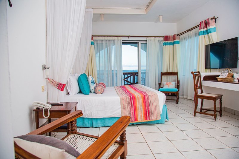 Doppelzimmer Superior Meerblick: Die Superior Meerblick Zimmer (ca 22 m²) verfügen bei gleicher Ausstattung über ein Kingsizebett und Meerblick (DMU/DME).