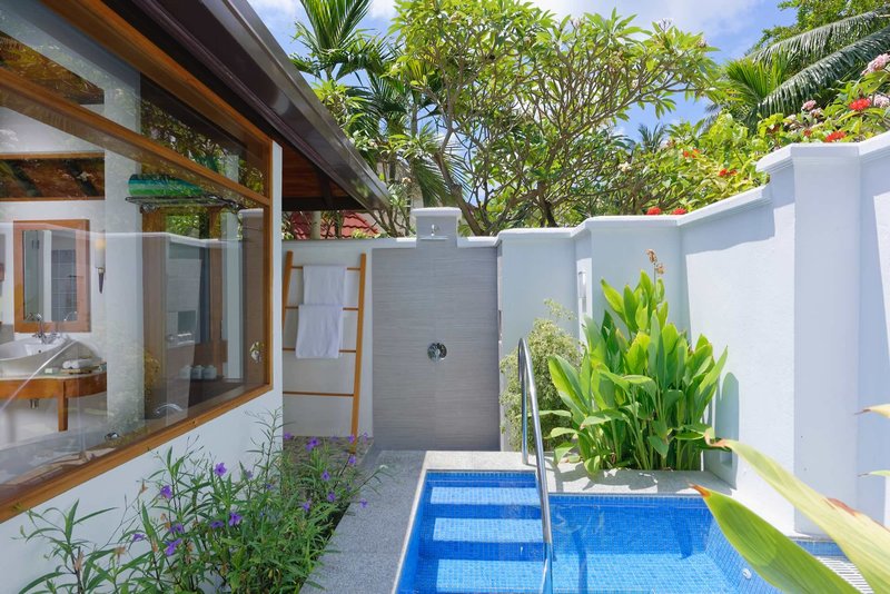 Beach Villa: A kb. 103 m²-es tengerparti villák a kerti medencés villákhoz hasonló felszereltséggel kínálnak pezsgőfürdőt a külterületen.