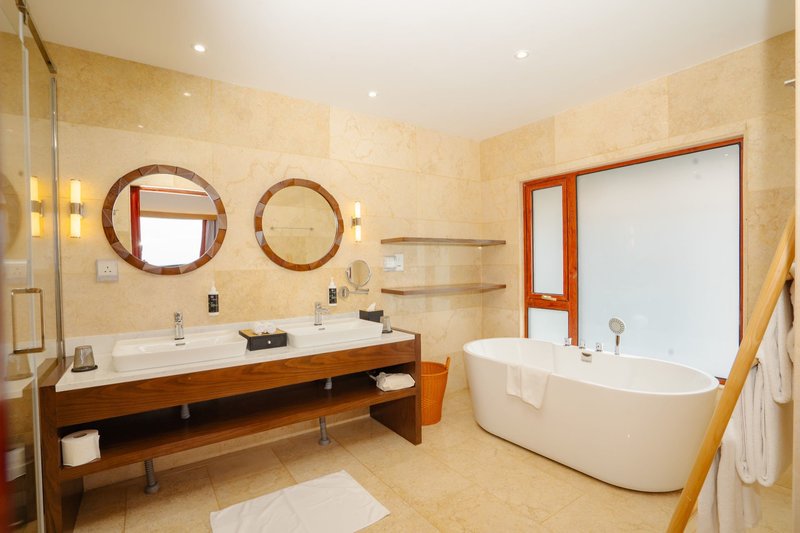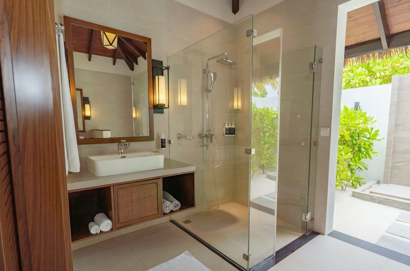 A Maldív-szigeteken a mosdókagyló vagy a fürdőkád/pezsgőfürdő nyíltan beépíthető a szállodai szoba általános nappalijába térbeli elválasztás nélkül.