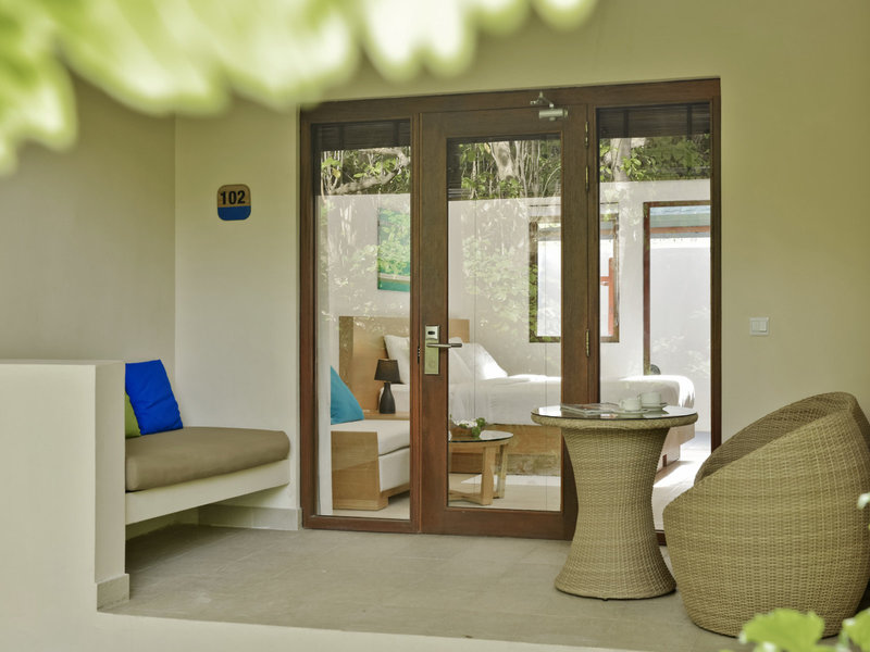 - Promo Room (DZX1), Nichtraucherzimmer, Gartenseite, Gartenblick, Blick auf garden, ca. 38 m², Gesamtanzahl der Räume in diesem Zimmertyp: 1, Aufteilung wie folgt: 1 Schlafzimmer, 1 Queen Size Bett (160x200cm), Klimaanlage: ohne Gebühr, Januar - Dezember, individuell regelbar, kalt, Fußboden: Fliesenboden, Safe: ohne Gebühr, Deckenventilator, Sofa, Schreibtisch, Bügeleisen, Bügelbrett, Kaffee-/Teezubereiter, Wasserkocher, Minibar: gegen Gebühr, Telefon, Internet: WLAN/WiFi: ohne Gebühr, Fernseher: im Schlafzimmer, deutsches Programm, Deutsche Welle, Kabel-TV, Roomservice: täglich 10:00 Uhr - 22:00 Uhr, gegen Gebühr, Reinigungsservice: täglich, ohne Gebühr, Dusche, Regendusche, WC, Bademantel: ohne Gebühr, Slipper: ohne Gebühr, Föhn, Terrasse: mit Liegestühlen, Veranda