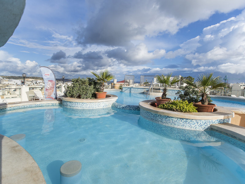 Lage & Umgebung Das ansprechende Hotel liegt in ruhiger Umgebung, nah am Stadtzentrum Qawras (ungefähr 1 km) und nur wenige Gehminuten von der schönen Strandpromenade (Felsbadestrand) entfernt. Auch das bekannte Bugibba-Zentrum mit seinen vielfältigen Einkaufsmöglichkeiten, Bars, Restaurants, Diskotheken sowie seinem Kasino und Multiplexkino erreichen Sie bequem zu Fuß. Die Transferzeit zum Flughafen Malta beträgt etwa 35 Minuten.