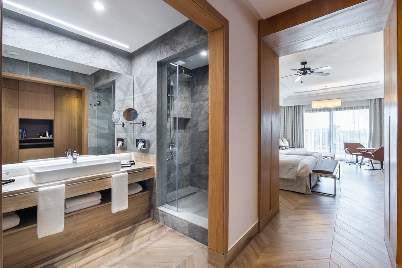 Doppelzimmer: Modern eingerichtete Doppelzimmer (D), geräumig mit ca. 46 m² Wohnfläche und verfügen über Bad/WC, Föhn, Kosmetikspiegel, Bademäntel, Klimaanlage/Heizung, Telefon (gegen Gebühr), Sat.-TV, Tee-/Kaffeezubereiter, Minibar (wird regelmäßig aufgefüllt), Safe, Sitzecke mit Schlafsofa und Balkon oder Terrasse.