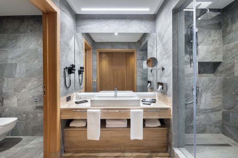 Kétágyas szobák: Modern berendezésű, tágas, kb. 46 m²-es kétágyas szobák (D), melyekhez fürdőszoba/WC, hajszárító, kozmetikai tükör, fürdőköpeny, légkondicionáló/fűtés, telefon (térítés ellenében), műholdas TV, tea-/kávéfőző, minibár (rendszeresen feltöltve), széf, ülősarok kanapéággyal és erkély vagy terasz tartozik.