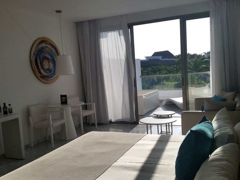 - Promoroom (JSZ1), Juniorsuite, Mindestalter im Zimmer: 18 Jahre, Poolseite, Poolblick, Gartenblick, ca. 45 m², Gesamtanzahl der Räume in diesem Zimmertyp: 1, Aufteilung wie folgt: kombiniertes Wohn-/Schlafzimmer, 3 Schlafzimmer, 1 King Size Bett (200x200cm), 1 Schlafsofa, Klimaanlage: zentral gesteuert, Fußboden: Fliesenboden, Safe: ohne Gebühr, Sofa, Bügeleisen, Bügelbrett, Kaffeemaschine, Minibar: ohne Gebühr, Softdrinks, Wasser, alkoholische Getränke, Minibarauffüllung: täglich, Telefon, Internet: WLAN/WiFi: ohne Gebühr, Fernseher: Flatscreen, Deutsche Welle, Sat-TV, Roomservice: ohne Gebühr, Reinigungsservice, Dusche, Regendusche, Badewanne im Zimmer, WC, Bad durch Glaswand getrennt, Föhn, Kosmetikspiegel, Balkon: mit Sitzgelegenheit