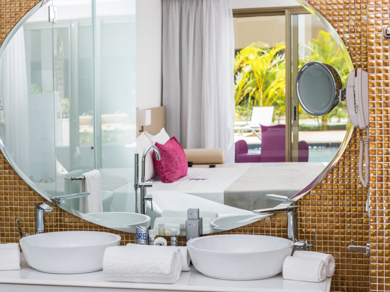 - Honeymoon Suite Pool Access (SUX2), Suite, Mindestalter im Zimmer: 18 Jahre, im Hauptgebäude, Poolseite, Poolblick, Gartenblick, ca. 65 m², Gesamtanzahl der Räume in diesem Zimmertyp: 1, Aufteilung wie folgt: kombiniertes Wohn-/Schlafzimmer, 6 Schlafzimmer, 1 King Size Bett, Moskitonetz, Klimaanlage: zentral gesteuert, Fußboden: Fliesenboden, Safe: ohne Gebühr, Sofa, Bügeleisen, Bügelbrett, Kaffeemaschine, Minibar: ohne Gebühr, Softdrinks, Wasser, Minibarauffüllung: täglich, Telefon, Internet: WLAN/WiFi: ohne Gebühr, bei All Inclusive inklusive, Fernseher: Flatscreen, im Schlafzimmer, Deutsche Welle, Sat-TV, DVD-Player, Roomservice: 24 Stunden, ohne Gebühr, bei All Inclusive inklusive, Reinigungsservice, Dusche, Regendusche, Badewanne im Zimmer, WC, Bademantel, Slipper, Föhn, Kosmetikspiegel, Terrasse: mit Liegen, mit Sitzgelegenheit, mit direktem Poolzugang, mit Whirlpool