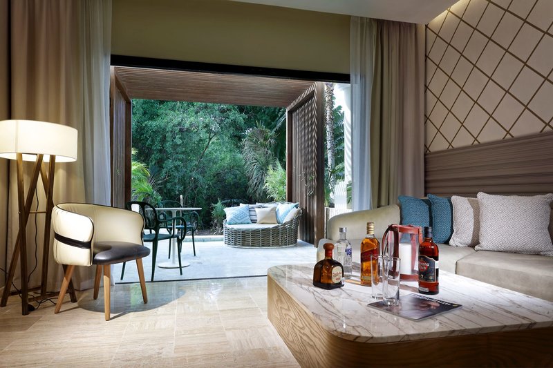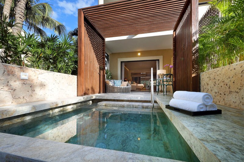 Junior lakosztály pezsgőfürdős terasszal, medence mellett: Ezek a szobák egy king size ággyal vagy két queen size ággyal, zuhanyzós/WC-s fürdőszobával, teraszon pezsgőfürdővel, hajszárítóval, fürdőköpennyel, vasalóval és vasalódeszkával, telefonnal, kábeltévével, széffel, mennyezeti ventilátorral, légkondicionálóval, komornyikszolgálattal (8:00-23:00), 24 órás szobaszervizzel és minibárral (J2A) rendelkeznek.