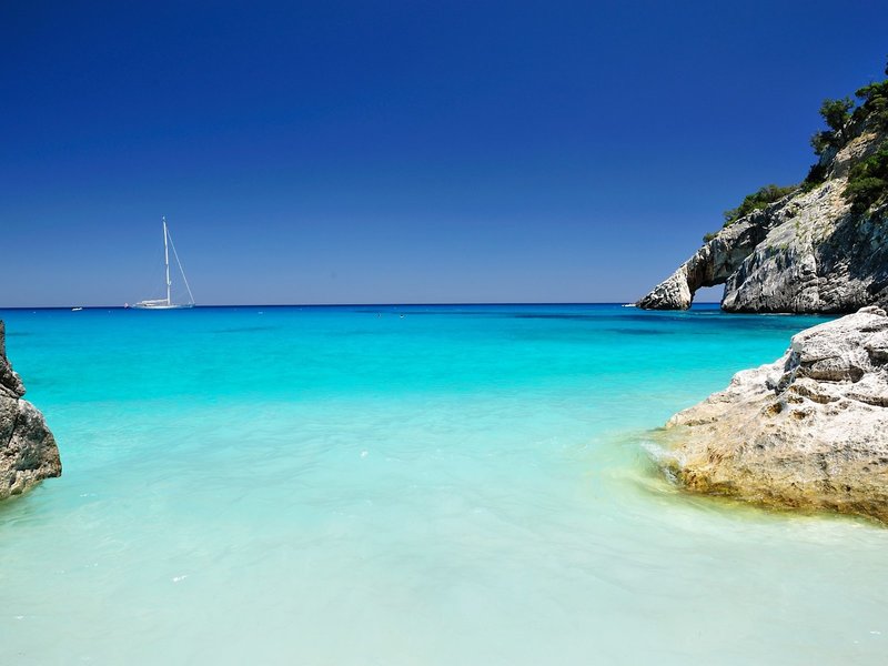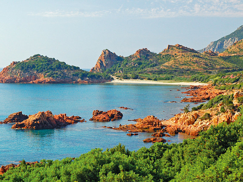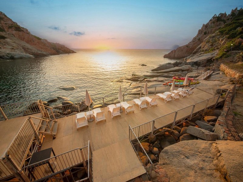 - Cala Moresca strand: sziklás, természetes, nyugágyak, napernyők