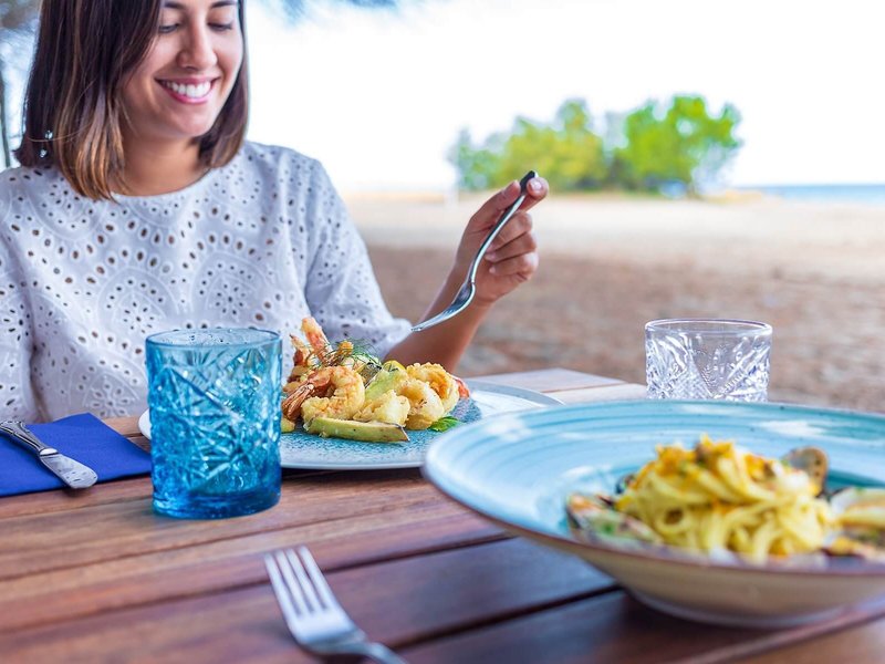 Essen & Trinken: Der gastronomische Bereich wartet mit einem Restaurant und einer Bar auf. Erfrischende Drinks an der Strandbar sorgen für Wohlfühlmomente. Die Unterbringung bietet als buchbare Verpflegungsleistungen Halbpension und Vollpension. Ein kontinentales Buffetfrühstück, Mittagessen und Abendessen sind lecker und abwechslungsreich gestaltet. Es stehen alkoholfreie Getränke zur Auswahl.