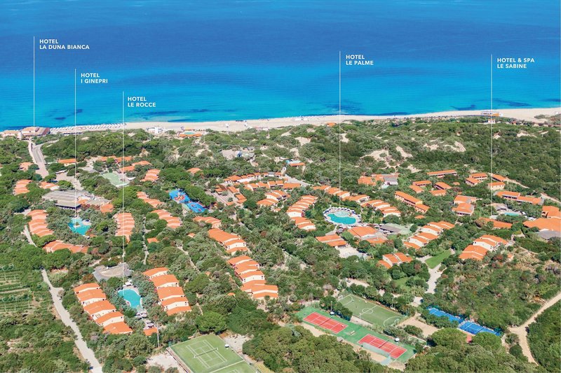 Szolgáltatások: Az üdülőhely 5 szállodája több mint 280 000 m²-en, gyönyörű macchia tájon terül el dűnékkel és illatos borókafákkal, és összesen 496 szobával rendelkezik. 4 recepció, 9 étterem, 6 bár és rengeteg hely kínál kikapcsolódást és szórakozást. Az üdülőhely tágas, gyönyörű szabadtéri területén 6 úszómedence, az "I Ginepri" szállodában a fő medence, a "Le Palme" szállodában 2 medence található, egy gyermekmedencével vízi játékokkal, a "Le Rocce" hotelben egy medence, a "Le Sabine" szállodában egy medence, valamint a "Villagoi Fantasia" gyermekmedence nyugágyakkal.