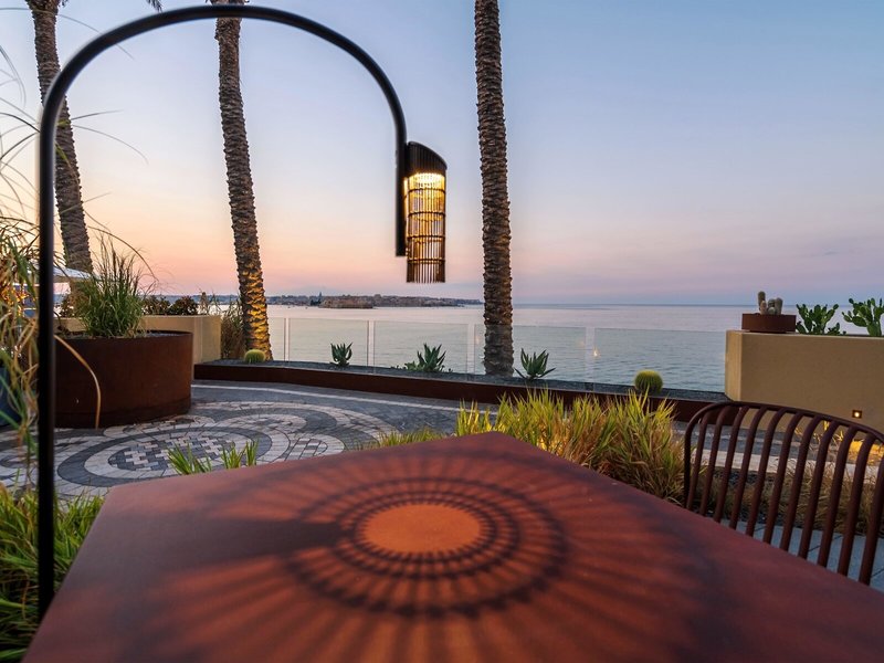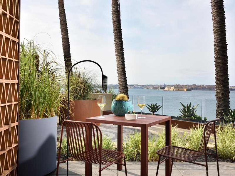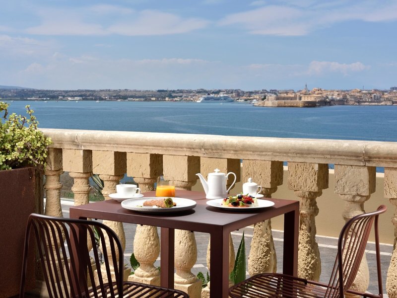 - Panoramic Suite Sea View (DZM3), Doppelzimmer, Meerblick, Blick auf ORTIGIA, ca. 40 - 44 m², Gesamtanzahl der Räume in diesem Zimmertyp: 1, Aufteilung wie folgt: kombiniertes Wohn-/Schlafzimmer, Wohnzimmer, 1 Doppelbett, Babybett: ca. 15 EUR, Anfrage & Reservierung notwendig, Klimaanlage: ohne Gebühr, zentral gesteuert, Heizung: zentral gesteuert, Safe: ohne Gebühr, Schreibtisch, Minibar: gegen Gebühr, Telefon, Internet: WLAN/WiFi: ohne Gebühr, Breitband-Internet/DSL: ohne Gebühr, Fernseher: Flatscreen, Sat-TV, Roomservice: gegen Gebühr, Tageszeitung: gegen Gebühr, Sprachen: deutsch, englisch, italienisch, französisch, Dusche, WC, Bademantel: ohne Gebühr, Slipper: ohne Gebühr, Föhn, Balkon oder Terrasse: mit Sitzgelegenheit