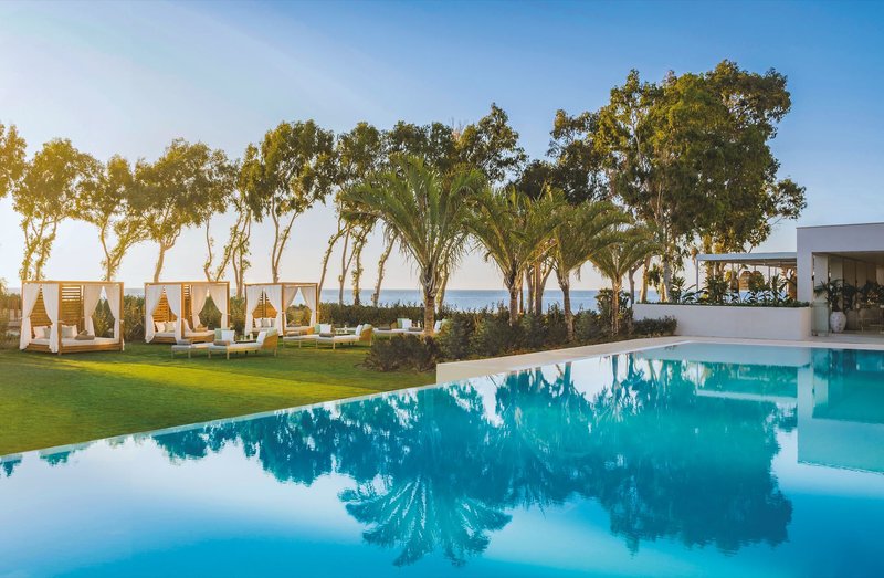 Ausstattung: Das auf 85.000 m² errichtete 5-Sterne Hotel der bekannten griechischen Ikos Resorts-Hotelgruppe verfügt über insgesamt 425 Zimmer und Suiten, verteilt auf 9 Gebäude und zwei Villen. Zur Ausstattung gehören ein Empfangsbereich mit 24 h-Rezeption, Lobby mit Sitzgruppen, ein mediterranes Haupt-/Buffetrestaurant und 9 À-la-carte-Restaurants: "Ouzo" (griechische Küche), "Fresco" (italienische Küche), "Provence" (französische Küche), "Anaya" (asiatische/orientalische Küche), "Olivia" (spanische Küche), "Chiringuito" (spanische Tapas), "Seasons" (Open-Air Restaurant mit saisonaler mediterraner Küche, zum Frühstück und mittags nur für Deluxe Gäste geöffnet, abends für alle Gäste), "Beach Club" (internationale Küche und mediterrane in entspannter Atmosphäre), 'Flavors' (reichhaltige mediterrane Buffets, eine vielseitige Auswahl an Weinen) und 8 Bars. Reservierung in allen À-la-carte-Restaurants zum Abendessen erforderlich. Kein Limit der Nutzung. Außenbereich mit wunderschön gestalteter Gartenanlage, Sonnenterrasse, 9 Süßwasser-Swimmingpools (Indoor ab 16 Jahren, Outdoor, Paddling Pool) mit Poolservice und dem Ikos Spa von Anne Semonin Paris. Liegen, Sonnenschirme und Handtücher stehen den Hotelgästen am Poolbereich sowie am Strand kostenfrei zur Verfügung.
