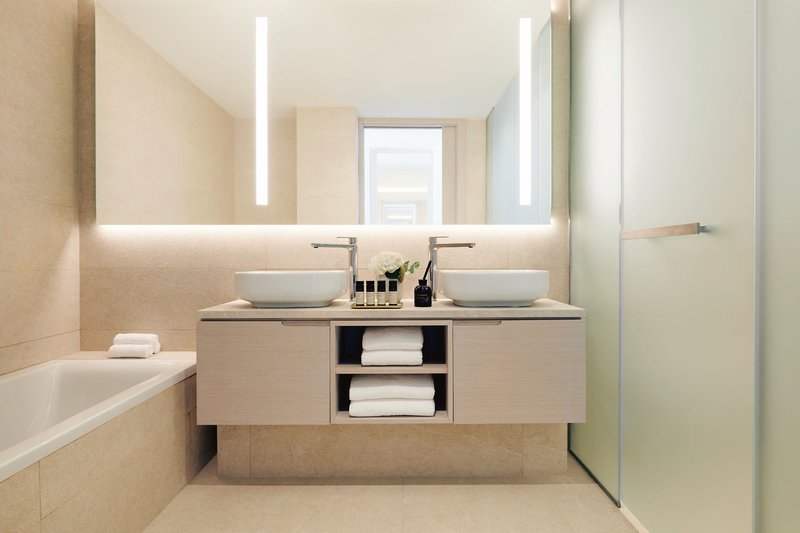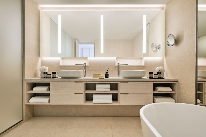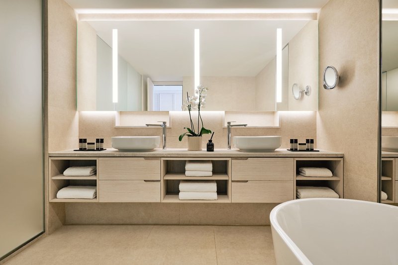 Doppelzimmer Promo: Die elegant und modern eingerichteten Doppelzimmer (PRZ) sind ca. 34 m² groß und verfügen über ein Badezimmer mit Badewanne und Dusche/WC, 2 Waschbecken, Föhn und kostenfreie Pflegeartikel, ein Doppelbett oder zwei Einzelbetten (Twin), Klimaanlage/Heizung, Mietsafe, Sat.-TV (Flachbildfernseher), DVD/CD-Player, Minibar (tägliche Auffüllung), Nespresso Maschine, Teekocher, Bademäntel, Slipper, Wi-Fi (inklusive) und möblierten Balkon (PRZ).