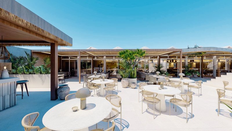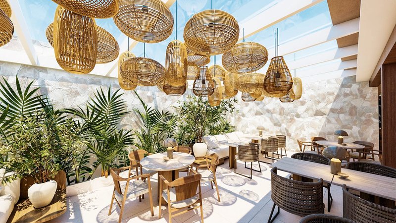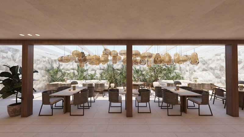 A kültéri területek között két úszómedence található (melyek közül az egyik télen fűtött), mindegyikhez napozóterasz, nyugágyak és napernyők tartoznak. Van egy tetőterasz is nyugágyakkal és lélegzetelállító kilátással a tengerre. Egy másik tetőteraszon egy külön nudista rész található nyugágyakkal.