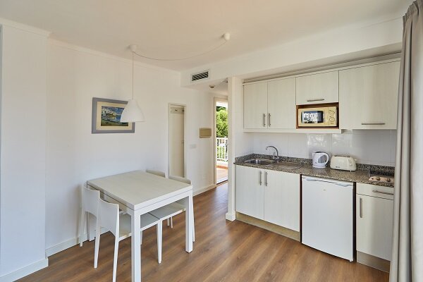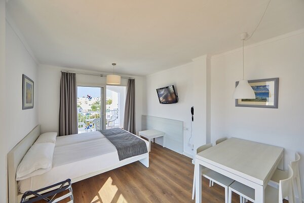 Die Studios verfügen über einen kombinierten Wohn-/Schlafraum mit Kitchenette, Bad oder Dusche/WC, Föhn, Klimaanlage/Heizung (stundenweise), Telefon, Sat.-TV, WLAN, Kaffee-/Teezubereitungsmöglichkeit, Minikühlschrank, Mietsafe und Balkon oder Terrasse. Die Appartements verfügen bei sonst gleicher Ausstattung zusätzlich über einen separaten Schlafraum.