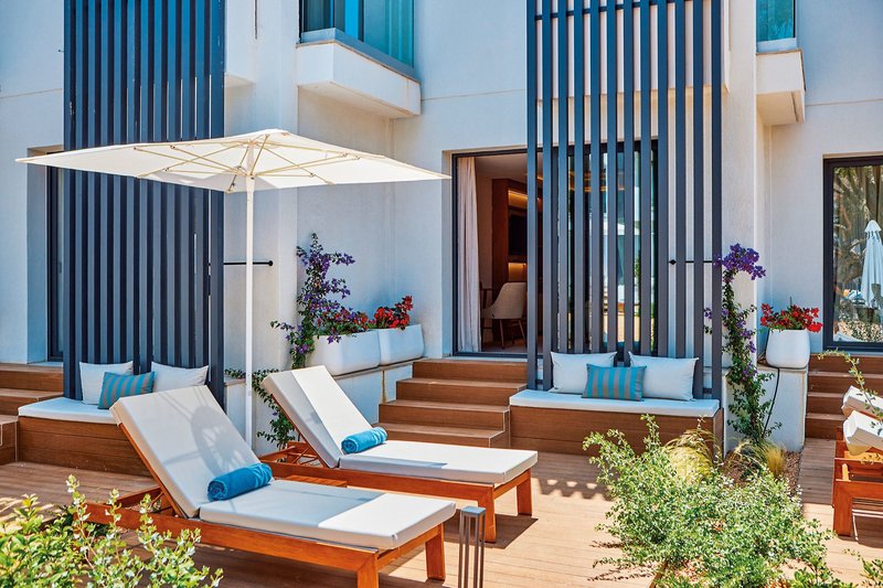 Juniorsuite Terrasse: Bei gleicher Ausstattung wie die Doppelzimmer sind diese geräumiger mit Wohnbereich und Terrasse mit Liegen (Zimmercodierung: TJS).