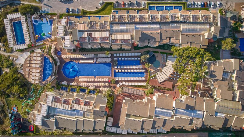 Das 4-geschossige Resorthotel verfügt über 289 Zimmer, die sich auf ein Hauptgebäude und 4 Nebengebäude verteilen. Es ist ausgestattet mit einer 24h geöffneten Rezeption, einer Lobby, einer Klimaanlage, einem Minimarkt, diversen weiteren Shops. Für das leibliche Wohl sorgen 3 Restaurants mit Klimaanlage und eine Snackbar. In den beiden Bars im Hotel freut man sich auf Ihren Besuch. WLAN steht den Hotelgästen kostenlos zur Verfügung. Zum Außenbereich des im mediterranen Stil gestalteten Hotels gehört ein Pool mit einem Kinderbecken sowie eine Wasserrutsche. Hier stehen Sonnenschirme und Sonnenliegen kostenlos zur Verfügung.