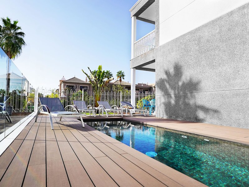Lage & Umgebung Dieser Apartmentkomplex liegt direkt neben den Golfplätzen von Playa de las Americas und ist zu Fuß nur einige Minuten vom Zentrum mit seinen vielen Bars, Restaurants und Ausgehmöglichkeiten entfernt. Eine Anbindung an das öffentliche Verkehrsnetz kann nach etwa 300 m erreicht werden. Etwa 700 m vom Hotel entfernt befinden sich der Strand und eine Reihe von Unterhaltungsmöglichkeiten. Der Flughafen Teneriffa liegt ungefähr 17 km von der Anlage entfernt.