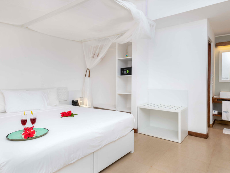 - Beach Junior Suite (DZX3), bungaló, nemdohányzó szoba, északi oldal, kert felőli, kertre néző, kb. 35 - 35 m², utolsó teljes felújítás 2018-ban, összesen szobaszám ebben a szobatípusban: 1, elrendezése a következő : kombinált nappali/hálószoba, 1 queen-size ágy, 1 kinyitható kanapé, 1 pótágy, kiságy: térítés nélkül, kérés és foglalás szükséges, szúnyogháló, klíma: térítés ellenében, január-december, központilag szabályozható, padló: járólapos emelet, széf: kaució ellenében, íróasztal, hűtőszekrény: térítésmentesen, kávéfőző/teafőző, telefon, Internet: WLAN/WiFi: 3 USD-tól, takarítás: naponta, ingyenes, zuhanyzó, wc, hajszárító, terasz : ülőgarnitúrával