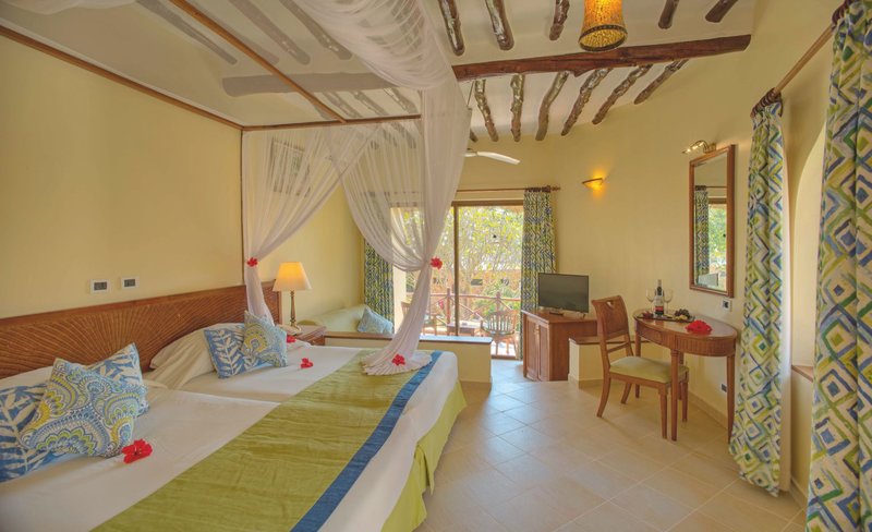 Doppelzimmer Baobab Room: Die Baobab-Zimmer befinden sich in authentischen Makuti gedeckten Bungalows und bieten einen schönen Blick auf die tropischen Gärten des Resorts. Die Zimmer verfügen über ein geräumiges Schlafzimmer mit Moskitonetz am Bett, ein Bad mit Dusche, Klimaanlage, Flachbildschirm, Minibar (gegen Gebühr), Safe, Telefon, einen Föhn und einer großen Veranda oder Terrasse.