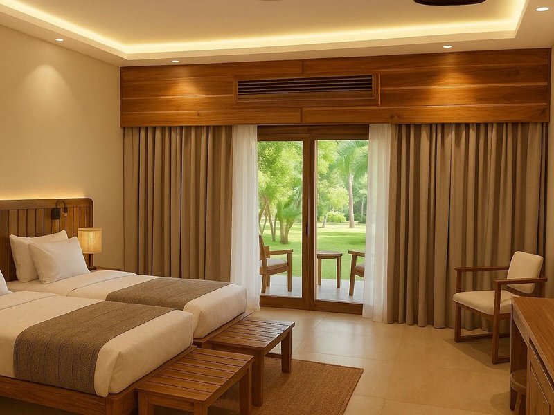 - Double Deluxe Family Garden View Room (FZG1), Bungalow, Nichtraucherzimmer, Gartenseite, Gartenblick, ca. 40 - 45 m², letzte Komplettrenovierung 2025, Gesamtanzahl der Räume in diesem Zimmertyp: 2, Aufteilung wie folgt: bestehend aus 2 Doppelzimmern mit Verbindungstür, 2 Einzelbetten (100x180cm), 1 Doppelbett (180x200cm), Babybett: ohne Gebühr, Klimaanlage: ohne Gebühr, individuell regelbar, kalt, Fußboden: Fliesenboden, Safe: ohne Gebühr, Deckenventilator, Kaffee-/Teezubereiter, Wasserkocher, Minibar: gegen Gebühr, Softdrinks: gegen Gebühr, Wasser: ohne Gebühr, alkoholische Getränke: gegen Gebühr, Snacks: gegen Gebühr, Telefon, Internet: WLAN/WiFi: ohne Gebühr, Fernseher: Flatscreen, im Schlafzimmer, Kabel-TV, Roomservice: täglich, gegen Gebühr, Reinigungsservice: täglich, ohne Gebühr, Dusche, Regendusche, WC, Föhn, Kosmetikspiegel, Terrasse: mit Sitzgelegenheit