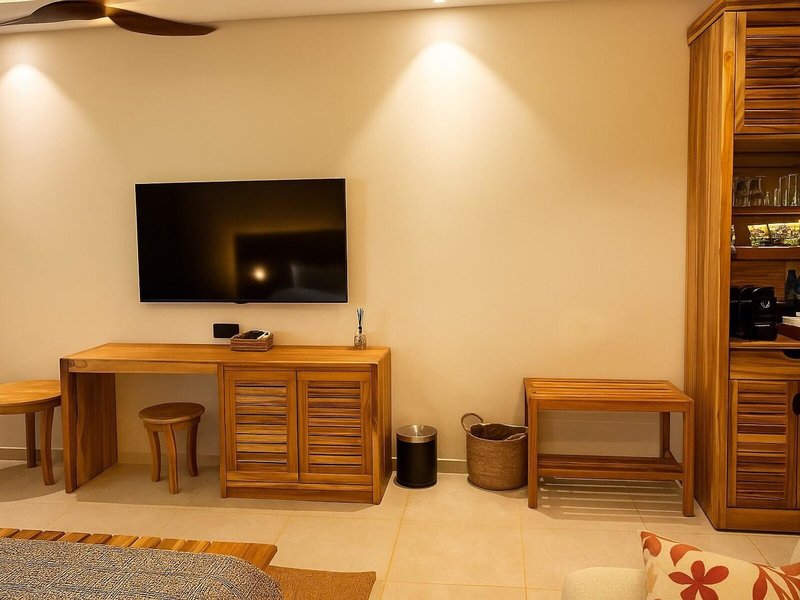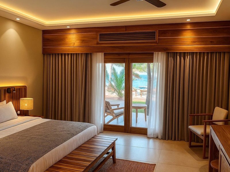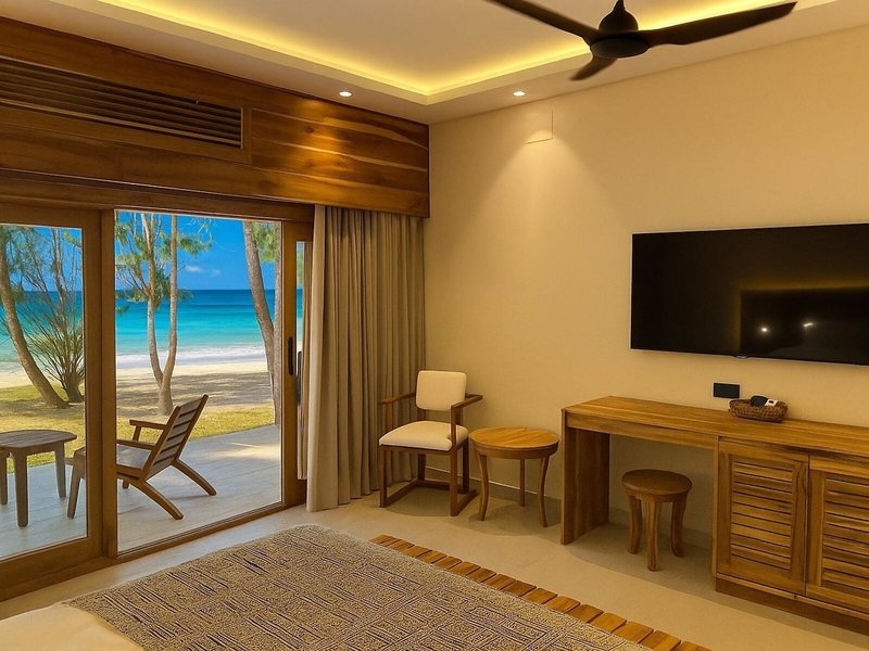 - Double Deluxe Ocean View Room (DZM1), Doppelzimmer, Nichtraucherzimmer, im Nebengebäude, erste Strandreihe, Meerblick, ca. 40 m², Gesamtanzahl der Räume in diesem Zimmertyp: 1, Aufteilung wie folgt: 1 Schlafzimmer, Klimaanlage: ohne Gebühr, individuell regelbar, kalt, Fußboden: Fliesenboden, Safe: ohne Gebühr, Deckenventilator, Kaffee-/Teezubereiter, Wasserkocher, Minibar: gegen Gebühr, Softdrinks: gegen Gebühr, Wasser: ohne Gebühr, alkoholische Getränke: gegen Gebühr, Snacks: gegen Gebühr, Telefon, Internet: WLAN/WiFi: ohne Gebühr, Fernseher: Flatscreen, im Schlafzimmer, Kabel-TV, Roomservice: täglich, gegen Gebühr, Reinigungsservice: täglich, ohne Gebühr, Dusche, Regendusche, WC, Föhn, Balkon oder Terrasse