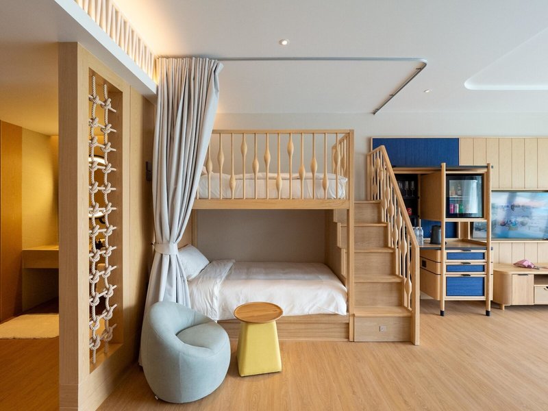 - Family Sea View Suite (DZM2), Suite, Meerblick, ca. 91 m², Gesamtanzahl der Räume in diesem Zimmertyp: 1, Aufteilung wie folgt: kombiniertes Wohn-/Schlafzimmer, 1 King Size Bett (200x200cm), 1 Etagenbett (120x200cm), Klimaanlage: ohne Gebühr, zentral gesteuert, Heizung: zentral gesteuert, Fußboden: Laminat, Safe: ohne Gebühr, Deckenventilator, Sofa, Schreibtisch, Bügeleisen, Bügelbrett, Nespressomaschine, Kaffee-/Teezubereiter, Wasserkocher, Minibar: gegen Gebühr, Softdrinks: gegen Gebühr, Wasser: ohne Gebühr, alkoholische Getränke: gegen Gebühr, Snacks: gegen Gebühr, Minibarauffüllung: 24 Stunden, Telefon, Internet: WLAN/WiFi: ohne Gebühr, Fernseher: Flatscreen, Sat-TV, Roomservice: täglich 24 Stunden, gegen Gebühr, Reinigungsservice: täglich 24 Stunden, ohne Gebühr, Dusche, Regendusche, Badewanne, WC, Bademantel: ohne Gebühr, Slipper: ohne Gebühr, Föhn, Balkon: mit Sitzgelegenheit