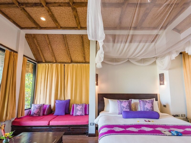 - Deluxe Villa (BUX1), Villa, Nichtraucherzimmer, Gartenseite, Gartenblick, ca. 73 m², letzte Teilrenovierung 2017, Gesamtanzahl der Räume in diesem Zimmertyp: 1, Aufteilung wie folgt: kombiniertes Wohn-/Schlafzimmer, 0 Doppelbetten, 1 King Size Bett, 1 Schlafsofa, Babybett: ohne Gebühr, Anfrage & Reservierung notwendig, Moskitonetz, Klimaanlage: individuell regelbar, Fußboden: Fliesenboden, Safe, Deckenventilator, Schreibtisch, Kühlschrank: ohne Gebühr, Kaffee-/Teezubereiter, Wasserkocher, Minibar: gegen Gebühr, Wasser: ohne Gebühr, Telefon, Internet: WLAN/WiFi: ohne Gebühr, Fernseher: Flatscreen, im Schlafzimmer, Kabel-TV, Roomservice: täglich 06:30 Uhr - 22:00 Uhr, gegen Gebühr, Reinigungsservice: täglich, ohne Gebühr, separate Dusche, Außendusche, separates WC, Bademantel: ohne Gebühr, Slipper: ohne Gebühr, Föhn, Kosmetikspiegel, Terrasse: mit Liegestühlen, mit Sitzgelegenheit