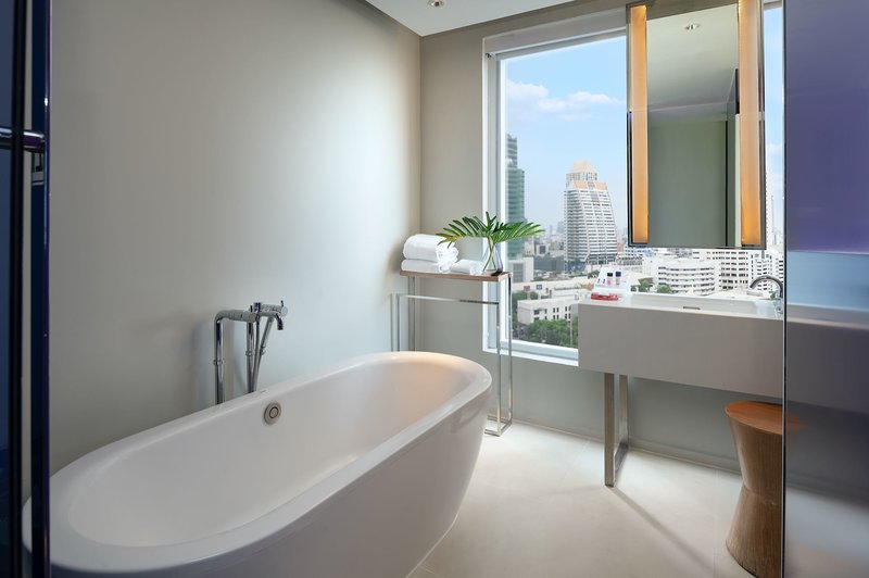 Thaiföldön a mosdók vagy a fürdőkádak/pezsgőfürdők nyíltan beépíthetők a szállodai szoba általános nappalijába térbeli elválasztás nélkül.