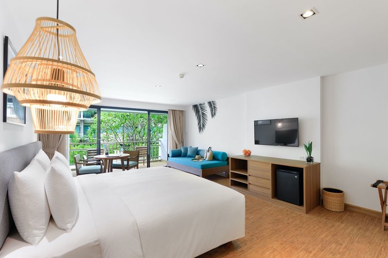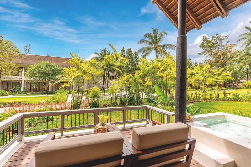 Deluxe Garden Balcony: Die Deluxe Garden Balcony Zimmer bieten einen erholsamen Rückzugsort mit Blick auf die üppigen Gärten des Resorts. Jedes Zimmer ist geschmackvoll eingerichtet und verfügt über ein komfortables Kingsize-Bett oder zwei Einzelbetten, ein modernes Badezimmer mit Regendusche sowie einen privaten Balkon mit Sitzgelegenheiten, ideal für entspannte Momente unter freiem Himmel. Die Zimmer sind in warmen Farbtönen gehalten und mit thailändischen Akzenten gestaltet, die eine harmonische Atmosphäre schaffen. Zur Ausstattung gehören Klimaanlage, Flachbildfernseher, Minibar, kostenfreies Wi-Fi und ein Schreibtischbereich für Gäste, die während ihres Aufenthalts arbeiten möchten (DD2).