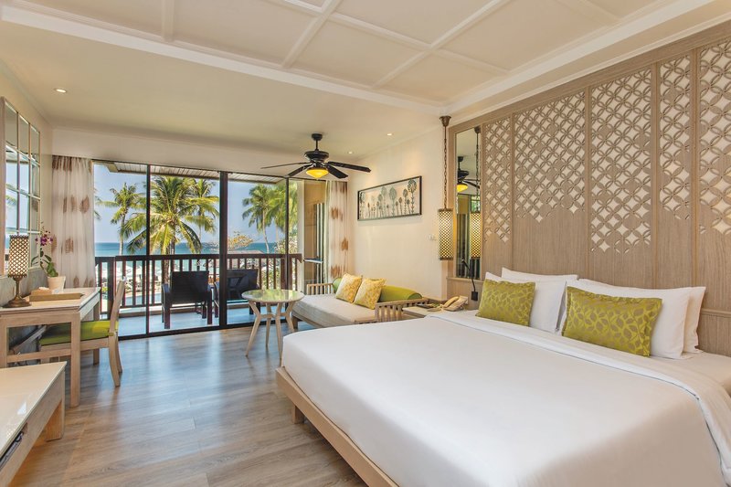 Juniorsuite: Die modern eingerichteten Juniorsuiten (ca. 45-50 m²) liegen im Thani Wing und verfügen über ein Kingsizebett, Schreibtisch und Sitzgelegenheit, Badezimmer mit Badewanne und separate Dusche/WC, Föhn, Slipper, Klimaanlage, Sat.-TV, DVD-Player, Telefon, Safe, Minibar (gegen Gebühr), Wasserkocher für Kaffee-/Teezubereitung und möbliertem Balkon mit Meerblick (JS2).