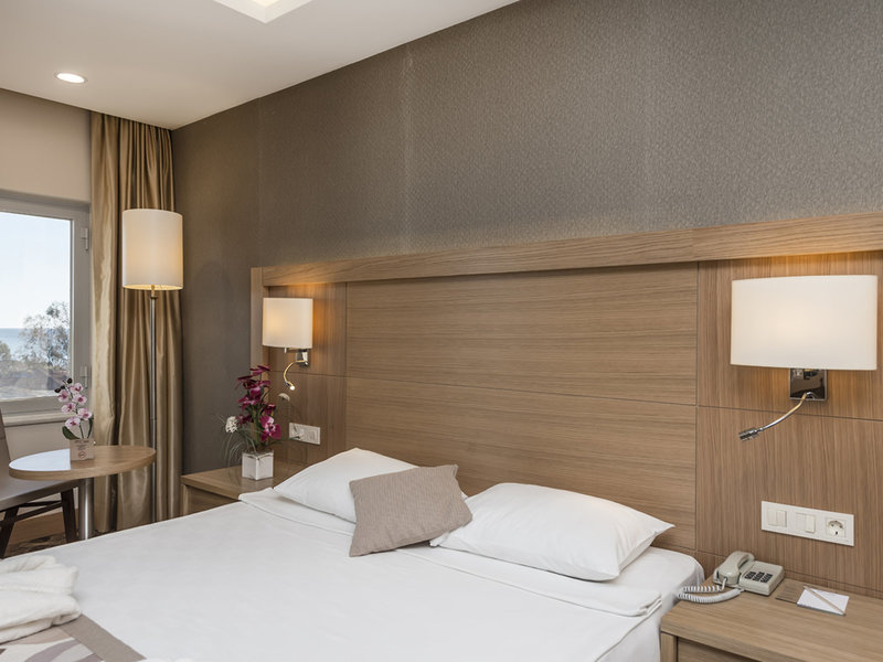 - Deluxe szoba kilátással a tengerre (DZM1), kétágyas szoba, nemdohányzó szoba, a főépületben, tengerre néző, oldalsó kilátással a tengerre, kb. 1 hálószoba, 1 franciaágy (180x200cm), szúnyogháló , Klíma: ingyenes, szezonális, központilag szabályozható, Fűtés: szezonális, Padló: szőnyeg, parketta, Széf: ingyenes, Kávé/teafőző, vízforraló, Minibár : ingyenes, Üdítőitalok: ingyenes, Víz: ingyenes, Minibár feltöltése: naponta, telefon, Internet: WLAN/WiFi: térítésmentes, televízió: műholdas TV, szobaszerviz: naponta, ingyenes, takarítás: naponta, térítésmentes, zuhany, fürdőkád integrált pezsgőfürdővel, pezsgőfürdő, wc, fürdőköpeny: térítés ellenében, papucs: ingyenes, hajszárító, kozmetikai tükör, erkély: ülőgarnitúrával