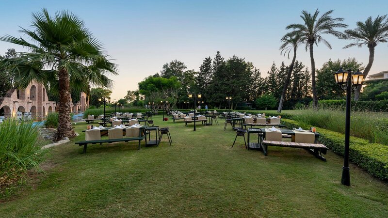 Die grüne Hotelanlage verfügt über 465 Zimmer, verteilt auf 9 Etagen. Zur Einrichtungen gehören die große Empfangshalle mit Rezeption, Lift, Internetcafé (geg. Geb.), WLAN, Friseur, TV-Ecke, Hauptrestaurant, 4 Á-la-carte-Restaurant, 7 Bars, Geschäfte, Juwelier, Diskothek, Amphitheater und ein Wellnesszentrum. In der Anlage erwarten Sie 3 Swimmingpools mit großzügigen Sonnenterrassen sowie die Pool-/Snackbar. Liegen, Sonnenschirme und Badetücher sind am Pool und am Strand kostenlos.