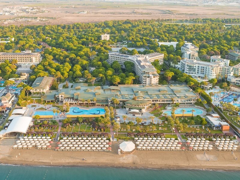 Lage & Umgebung Endlos goldene Strände, türkisblaues Wasser, tiefgrüne Wälder... Inmitten dieser abwechslungsreichen Landschaftskulisse an der türkischen Riviera liegt das Resort direkt am schönen Sandstrand – umgeben von einem riesigen Gartenareal mit Dünen, Pinien, Orangen- und Olivenbäumen. Das Zentrum von Belek liegt nur wenige Kilometer entfernt, mehrere Golfplätze befinden sich ebenfalls in der Umgebung. Transferzeit: ca. 45 Minuten.