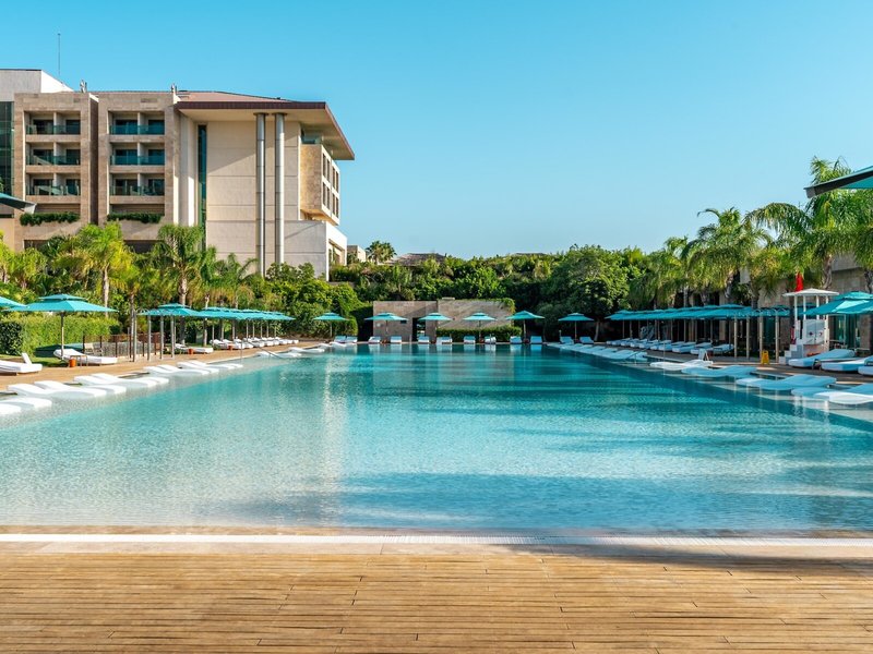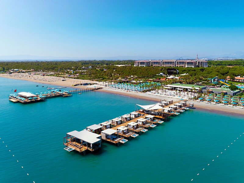 Lage & Umgebung Direkt an der Mittelmeerküste gelegen und von Pinienwäldern umgeben, bietet das Resort luxuriösen All Inclusive-Komfort für Erwachsene und Familien. Das Resort verfügt über 2 Golfplätze und 553 stilvolle Zimmer und Villen – darunter Swim-up-Zimmer, Familienzimmer und exklusive Poolvillen. Gäste genießen das ganze Jahr über vielfältige Kulinarik, Sport, Unterhaltung und Erholung am hellen Sandstrand. Antalya mit seinen Sehenswürdigkeiten und Shopping-Center befindet sich in ca. 40 km Entfernung. Transferzeit: ca. 45 Minuten.
